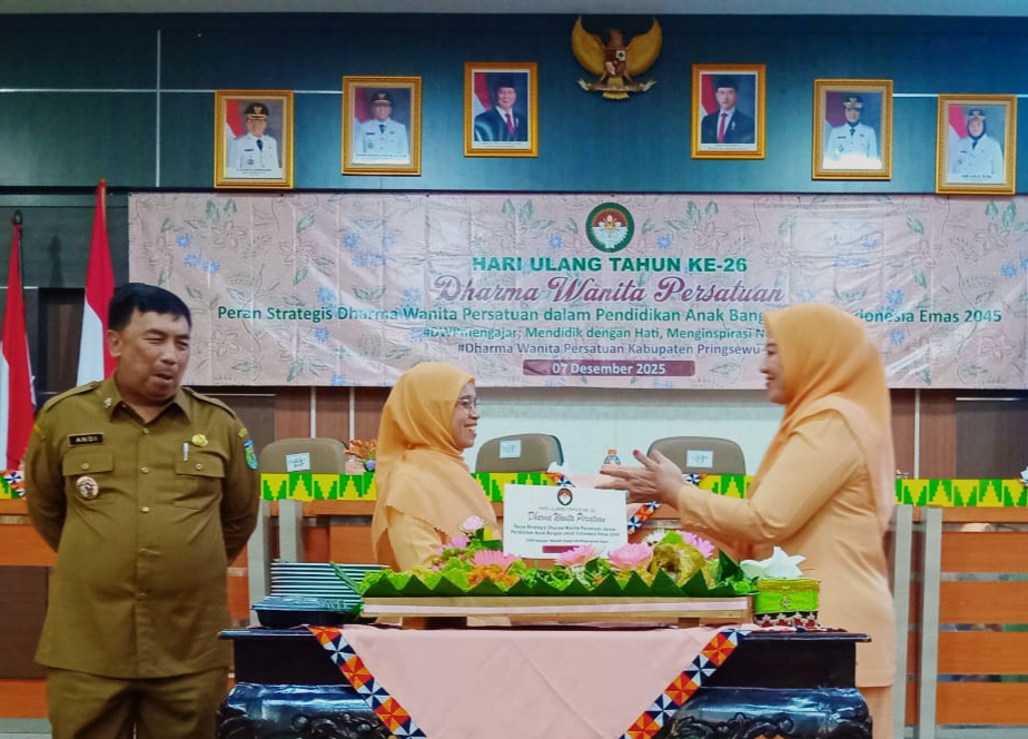 Pringsewu, Sepuluhdetik.id, — Bupati Pringsewu Riyanto Pamungkas diwakili Sekretaris Daerah Kabupaten Pringsewu Ir.M.Andi Purwanto, S.T., M.T. mengajak seluruh anggota Dharma Wanita Persatuan (DWP) untuk menjadikan momentum HUT ke-26 DWP sebagai sarana merefleksi diri dan bersyukur, sekaligus memanfaatkannya sebagai ajang pengembangan potensi para anggota guna menyongsong Indonesia Emas. Ajakan tersebut disampaikannya pada acara HUT ke-26 DWP di Aula Utama Kantor Bupati Pringsewu, Selasa (9/12/2025).