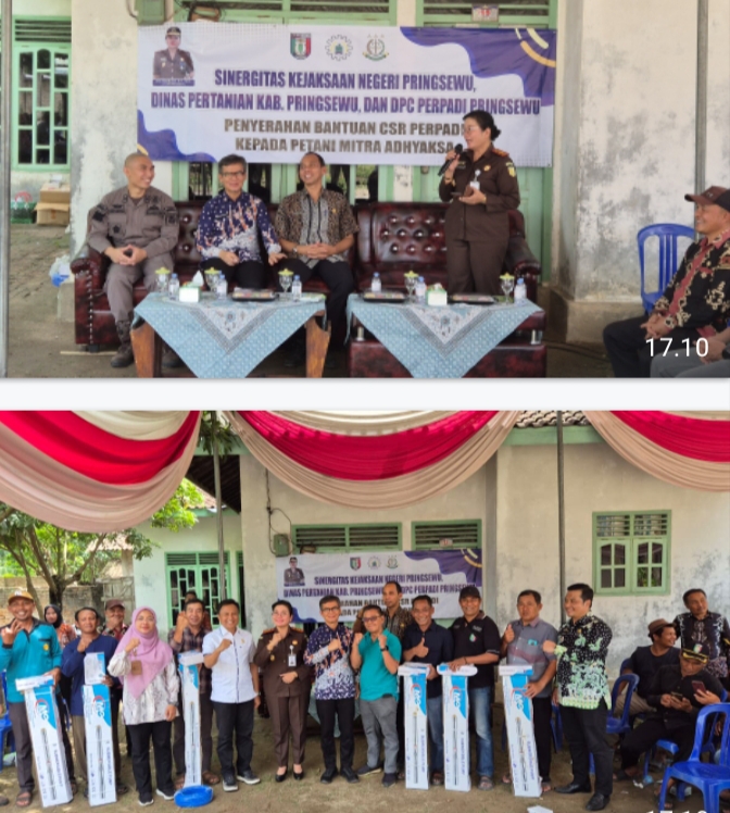 Kejaksaan Negeri Pringsewu bersama Dinas Pertanian Pringsewu memfasilitasi kegiatan penyerahan bantuan Corporate Social Responsibility (CSR) dari Persatuan Pengusaha Penggilingan Padi (Perpadi) Kabupaten Pringsewu kepada kelompok tani penerima manfaat dalam Program Petani Mitra Adhyaksa, yang dilaksanakan pada Kamis, 6 November 2025 sekira pukul 10.30 WIB di Pekon Tanjung Anom, Kecamatan Ambarawa, Kabupaten Pringsewu, Kamis (06/11/2025).