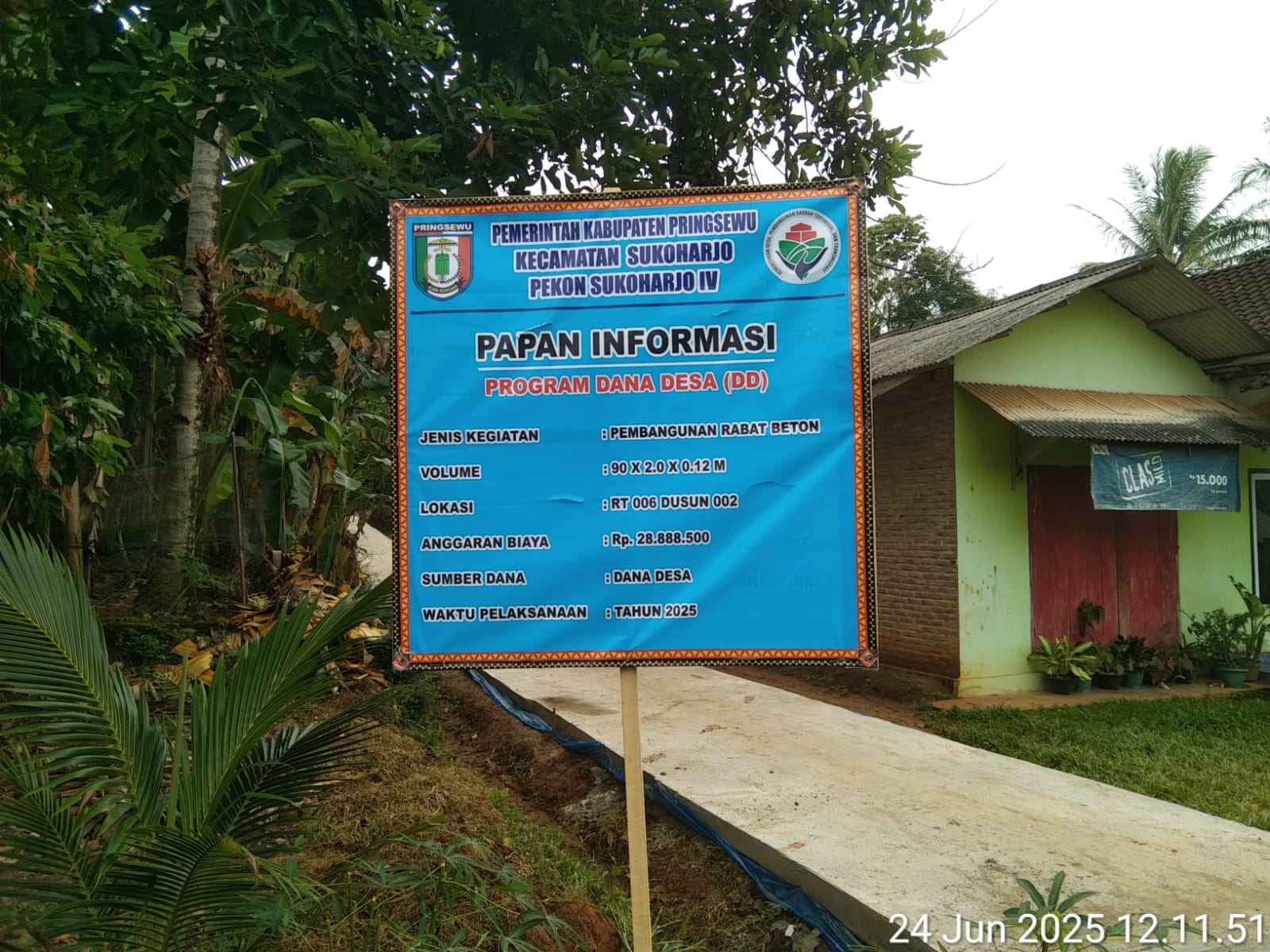 Pringsewu, Sepuluh detik.id, – Kegiatan pembangunan rabat beton di Pekon Sukoharjo IV, Kecamatan Sukoharjo, Kabupaten Pringsewu dengan anggaran kegiatan Rp 28.888.500, Dana Desa Tahun 2025 di tahap 1 yang dilaksanakan oleh Kaur Kesra melibatkan masyarakat RT 006/ Dusun 002 yang dibantu oleh Kadus dan berjalan lancar serta masyarakat ucapkan rasa trimakasih dengan Kakon Waringinsari Barat bapak Kamsidi.